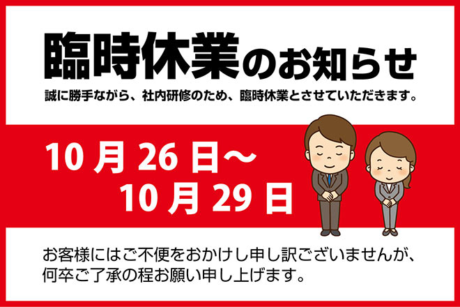誠に勝手ながら、下記の期間社内研修のため臨時休業とさせていただきます。