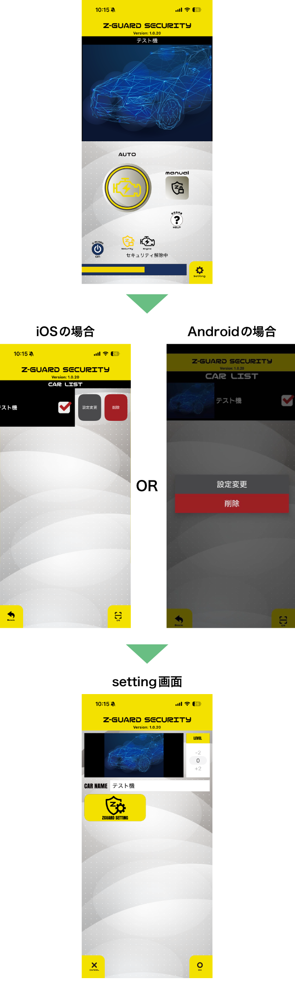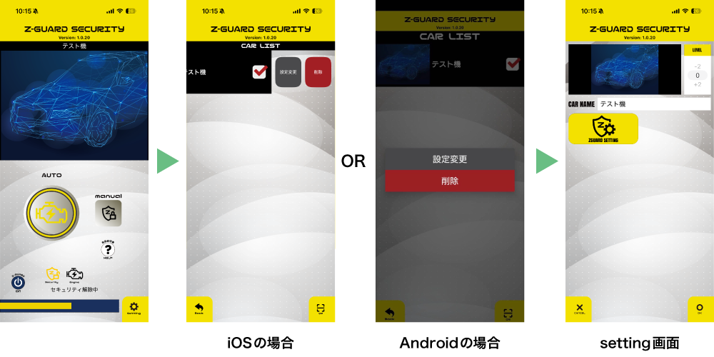 Androidの場合・・・CAR LIST内の該当車種を長押しすると、設定変更と削除が表示されます。