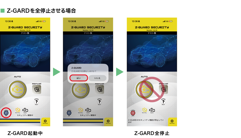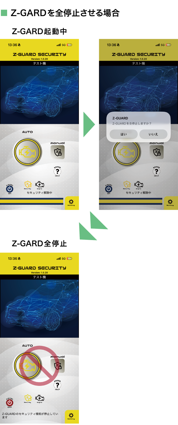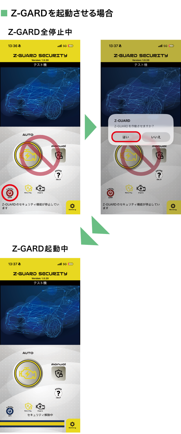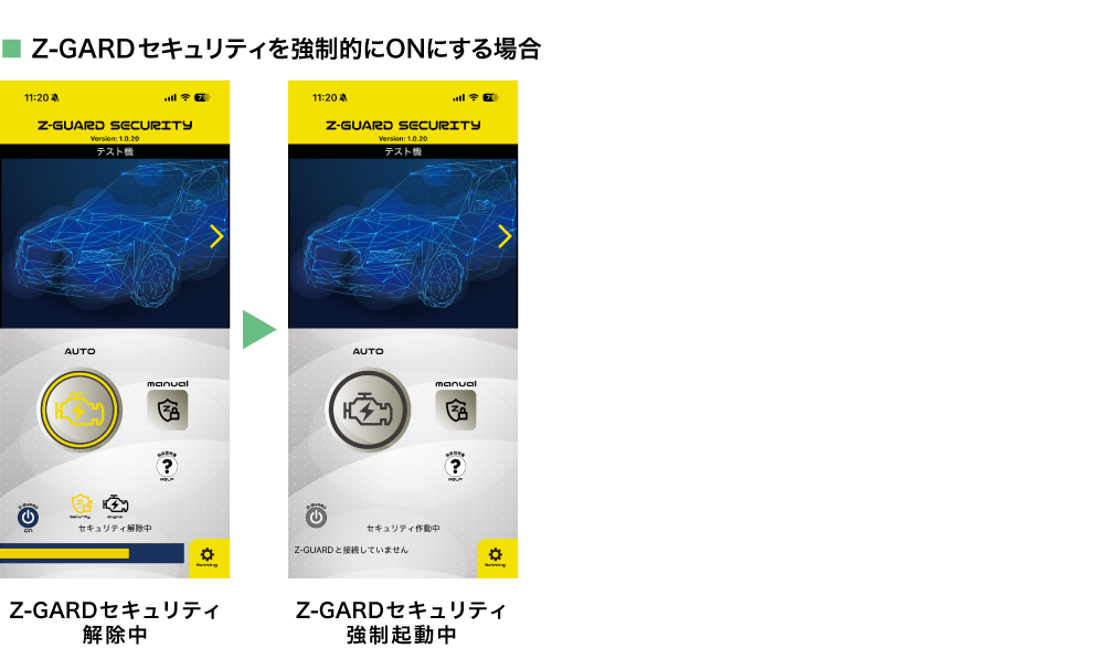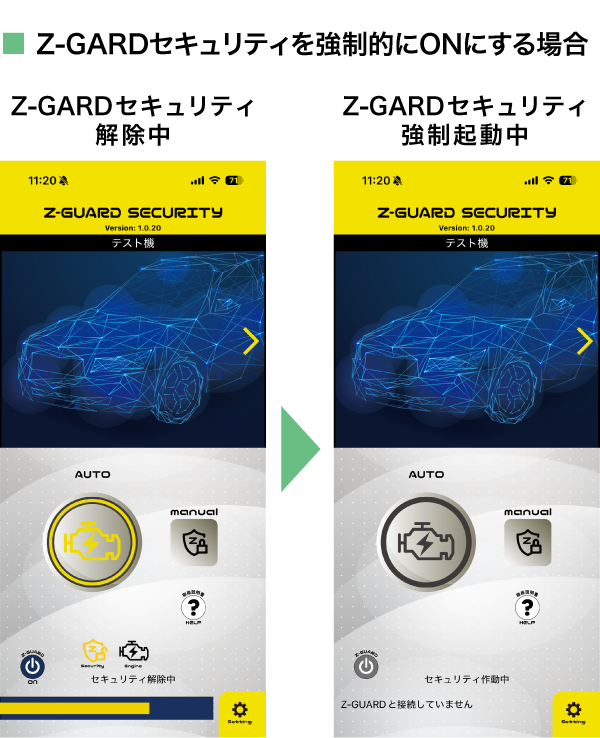 自宅などで車庫との距離が近く、セキュリティのON・OFFが繰り返すまたは、OFFのままになってしまう場合、Z-GUARDアプリの「AUTOボタン・Manualボタン」をOFFにして、セキュリティを強制的にONにすることができます。