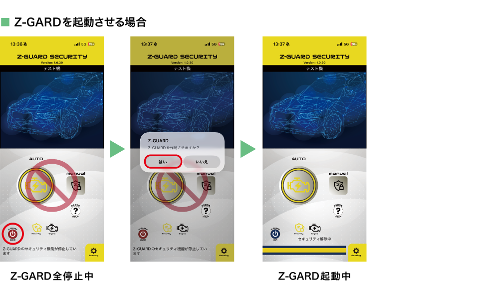 車両通信圏内に近づく又は、車両に乗り込んだ状態でZ-GUARDアプリを起動します。